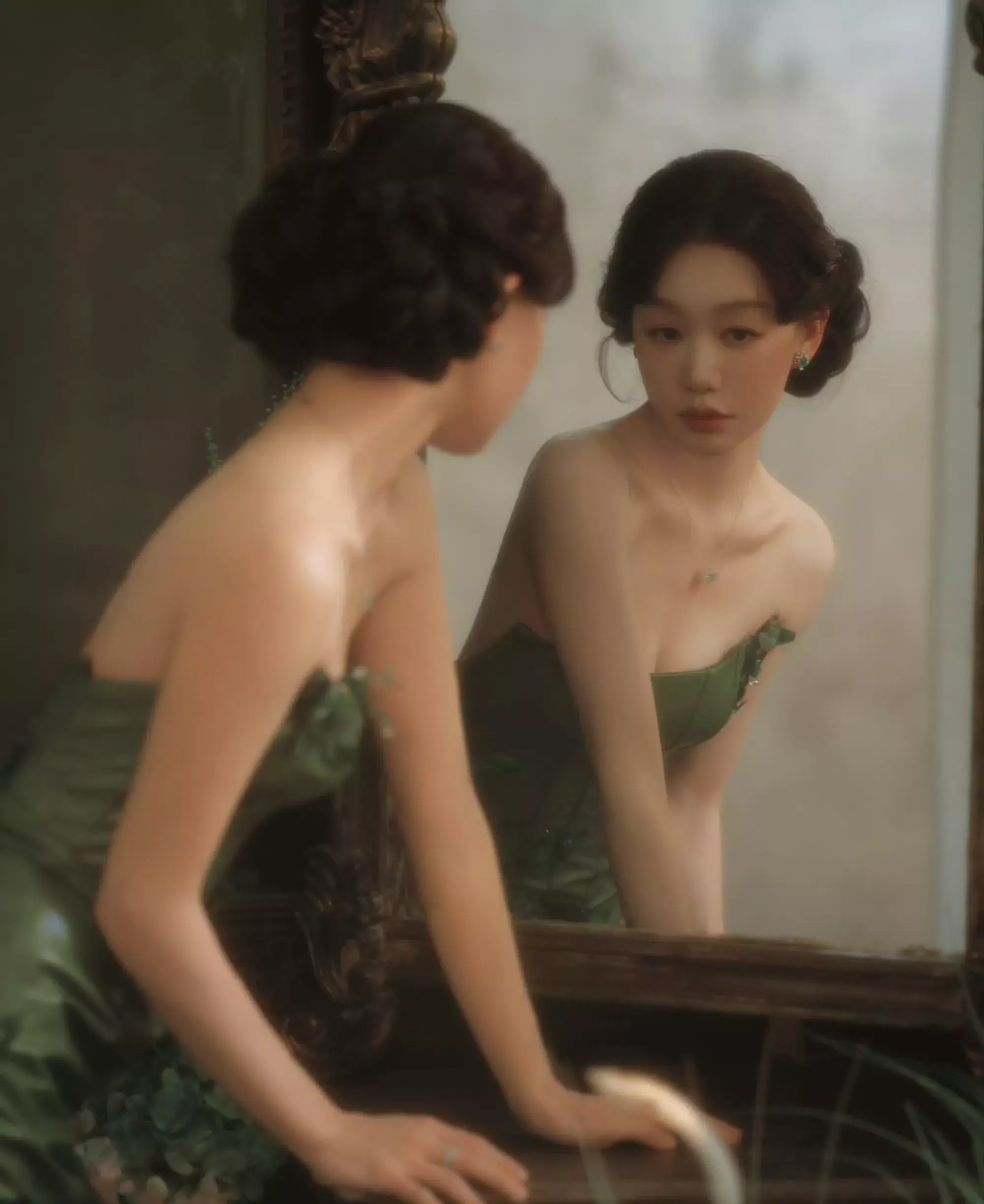 复古盘发拉高颅顶,让整体造型更显高挑利落,而低饱和度妆容的巧妙之处在于,弱化唇妆存在感,将视觉焦点集中在眉眼,一双含情眼在面纱掩映下更添朦胧美感。镶钻绿色耳钉作为点睛之笔,与裙装颜色形成同色系呼应,低调中暗藏奢华,让整套造型在复古基调中多了几分精致巧思。