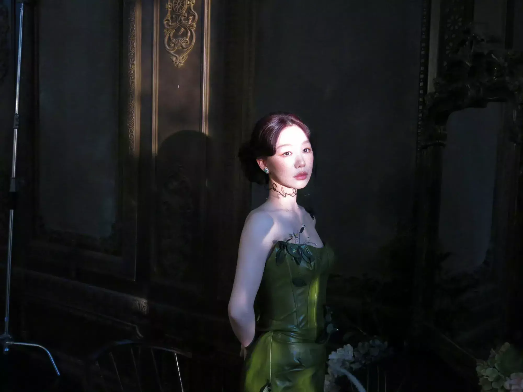 微卷复古盘发搭配半透蕾丝面纱,镶钻绿色耳钉与墨绿裙装精准呼应,低饱和度妆容着重勾勒眉眼神韵,破碎感与坚韧感交织的眼妆,让她在光影流转间宛如“画中人”,将古典气息与现代时尚完美融合,再次刷新大众对她的风格认知。